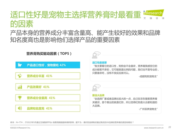 同时,宠物主在选择营养膏时,首先会考虑产品的适口性,即宠物爱吃;除此之外,营养成分丰富、产品效果和品牌知名度也是影响他们选择产品的重要因素。