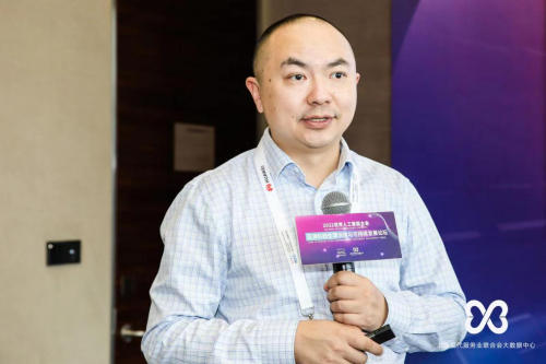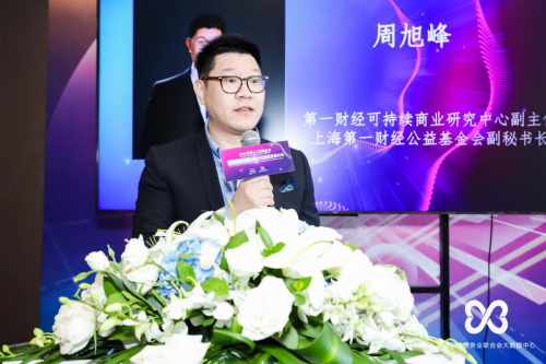 第一财经可持续商业研究中心副主任周旭峰致辞。他回顾了第一财经多年来在推动企业社会责任以及可持续发展方面做出的努力,并表示第一财经在未来会继续担负起媒体的社会责任,携手学界、业界、以及上海现代服务业联合会和大数据中心等社团组织共同推动科技向善,走可持续发展之路。