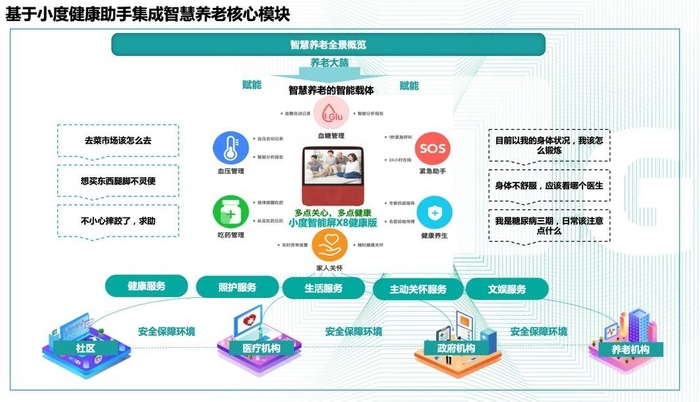 同时,针对养老服务体系的适老化需要,百度专为中老年人打造了一款软硬一体化智能终端——小度智能屏X8健康版,以百度强大的AI技术与互联网生态基础,小度智能屏X8健康版集合健康宣教、慢病管理、家庭关怀、休闲娱乐和生活照护等居家健康养老服务,让老人的所需所求触手可及。