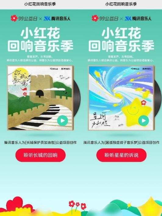 9月6日,由腾讯音乐人及腾讯公益联合TME音乐学堂和腾讯音乐公益推出的“小红花回响音乐季”系列公益专辑全部上线。在腾讯99公益日活动期间,腾讯音乐人通过各具特色的音乐创作,激发大众公益热情,传递爱与能量。