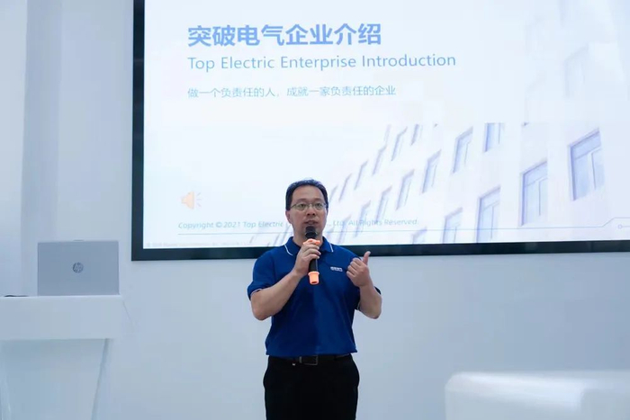天津生产中心总经理陈永环先生代表公司对突破电气品牌、产品线、技术研发实力、服务体系等做了全面介绍,重点对天津产业园区情况做了全面的讲解。