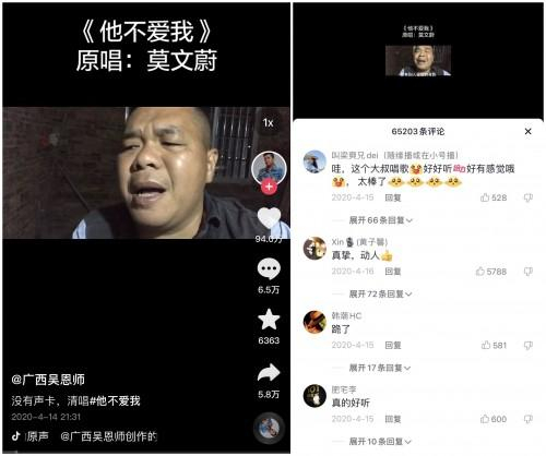 吴恩师本以为自己会一直这样做一个漂泊的“流浪歌手”,但2020年突如其来的疫情改变了一切。当时他被困在了广西老家无法外出唱歌,于是便听从旁人的建议将自己唱歌的短视频发到抖音,一条翻唱莫文蔚的《他不爱我》短视频让他从此意外走红。许多网友都说没点开前以为是个青铜,点开了以后发现是个王者,一开口唱立刻给人一种想象不到的惊艳。