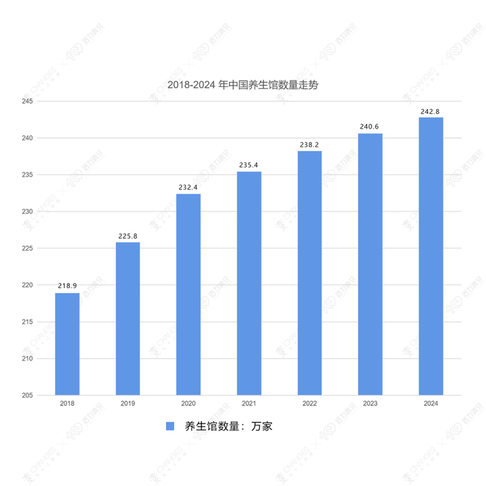 目前,国内的养生馆主要有连锁式养生馆、单店养生馆和家庭式养生馆。2017 年,我国养生馆数量达到208.5万家,其中家庭式养生馆数量最多,为130.2万家,连锁式养生馆数量仅25.4 万家。
