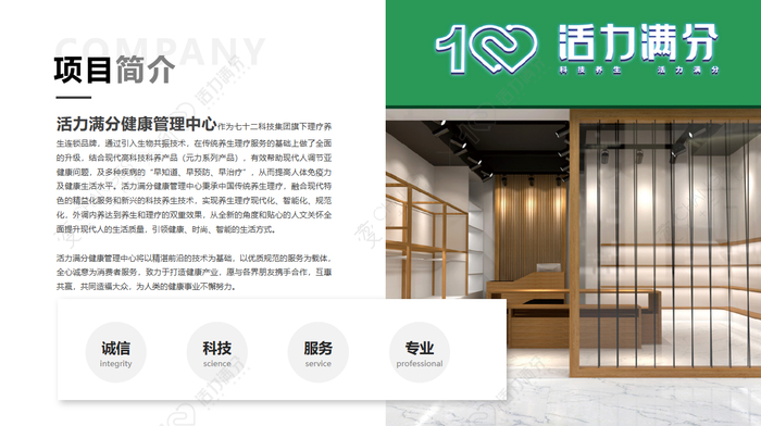 活力满分健康管理中心作为七十二科技集团旗下理疗养生连锁品牌,通过引入生物电共振技术,在传统养生理疗服务的基础上做了全面的升级,结合现代高科技理疗产品(元力系列产品),有效帮助现代人调节亚健康问题,做到“早知道、早预防、早理疗”,从而提高人体免疫力及生活水平。活力满分健康管理中心秉承中国传统养生理疗,融合现代特色的精益化服务和新兴的科技养生技术,实现养生理疗现代化、智能化、规范化,外调内养达到养生和理疗的双重效果,从全新的角度和贴心的人文关怀全面提升现代人的生活质量,引领健康、时尚、智能的生活方式。