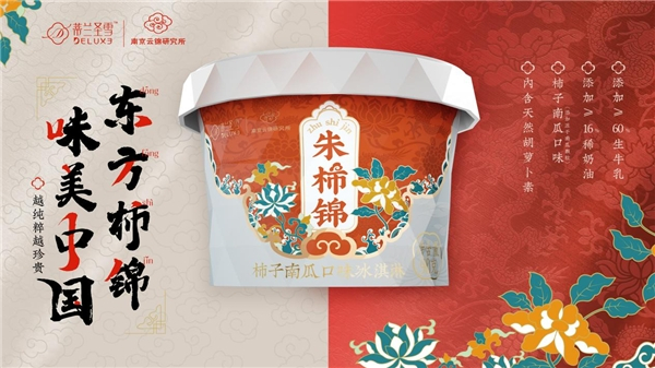 柿蒂纹、四季花卉、凤穿牡丹、吉庆双鱼,南京云锦在1600年的历史中,沉淀出许多富有吉祥寓意的云锦纹样,每个纹样都饱含着对生活的热爱与期待。在今年中秋,南京云锦研究所破圈联名蒙牛蒂兰圣雪,将传统多用于袍服的柿蒂纹,透过现代设计的二次转化,运用在联名产品上,推出“朱柿锦”联名冰品。