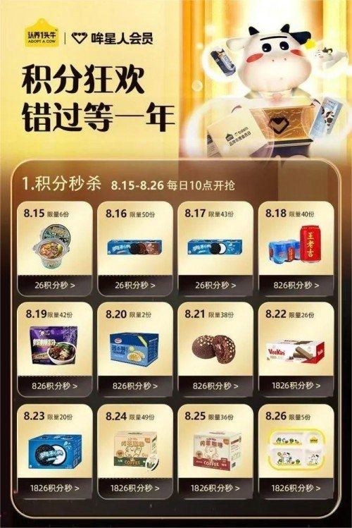 本次年度品牌会员活动开始之前,从8月15号开始便进行了连续10天的积分狂欢,每天10点,仅需积分就能参与不同产品的秒杀,在品牌会员日开始之前持续调动会员的积极性和活跃度。