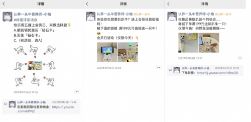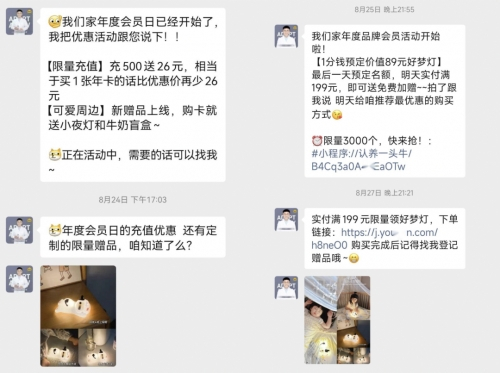 日常「认养一头牛」朋友圈以每天2-4次的更新频率内容包括当天的热门资讯、节日问候语、饮奶小知识、活动商品推荐、分享日常等。在品牌会员日期间,并不是时刻强调每一个活动,而是将会员活动非常有节奏地带出去,将活动效果最大化。