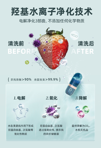果蔬清洗机的工作原理其实很简单。大部分果蔬清洗机采用的是羟基水离子净化技术,这种技术只需要用水作为原材料,通过电解水产生具有强氧化性的“羟基自由基”,能快速破坏农药、抗生素、激素等污染物的分子结构。不仅如此,还能将污染物降解为水、二氧化碳和无机盐对人体无害的物质。最后用清水冲洗,就能有效杀菌去农残。