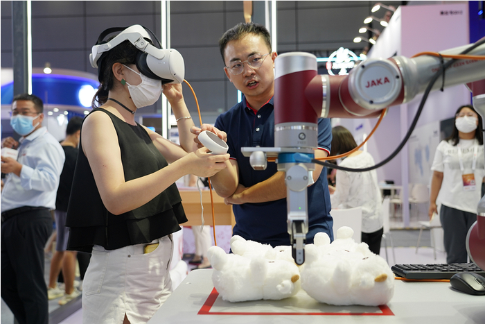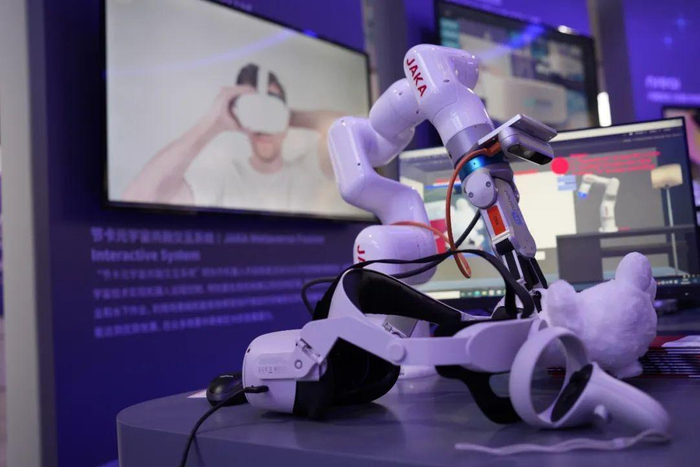 在世界人工智能大会上,节卡机器人元宇宙体验区,一位观众戴上了VR眼镜进入元宇宙系统,手持VR手柄操作,抓起了展示台上的毛绒玩具。不少观众惊叹不已,“元宇宙从想象变成了现实,太酷了”。