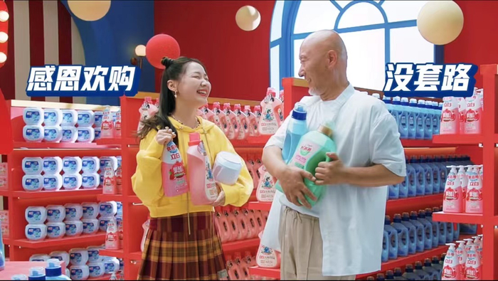 选角策略之外,立白这支广告片的情景设置策略也十分巧妙——以人均可见的超市促销场景,将天选主角二人拉入消费者生活的日常,集赞、满减门槛、加群、砍一刀,这些让消费者苦不堪言的营销套路,在二人实力表演逐级传达中土崩瓦解,营造出一种引人入胜的直接优惠购物情景。