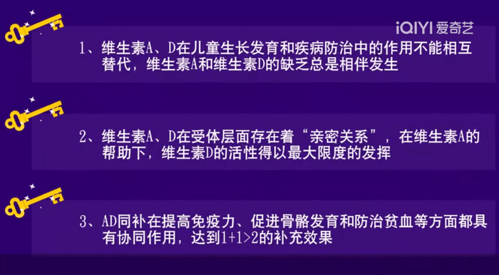 而维生素D受体,在维生素A的代谢产物“9-顺式-视黄酸”与视黄酸X受体结合的作用下,方能发挥出最大的生物活性。简言之,维生素A可以帮助维生素D发挥更强的作用,所以临床研究也发现,孩子体内维生素A浓度每增加1μmol/L,维生素D充足率会增加1.38倍。而在脑发育、身高、免疫力、造血功能等多个环节,维生素AD均具有协同作用。