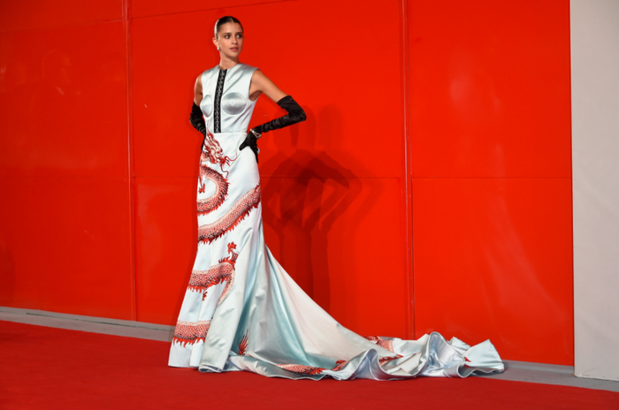Benedetta Porcaroli 身着古驰浅灰色丝绸礼服裙,饰有金属细节和手绘龙图样,搭配黑色缎面手套和黑色漆皮高跟鞋,出席电影《Amanda》红毯仪式。