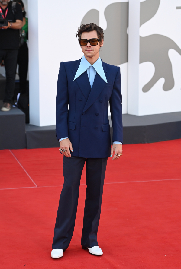 Harry Styles 身着古驰定制款蓝色双排扣翻领夹克,搭配浅蓝色尖领真丝绉绸衬衫、深蓝色喇叭裤和Gucci HA HA HA系列白色心形细节皮靴,出席电影《亲爱的别担心(Don't Worry Darling)》首映礼。