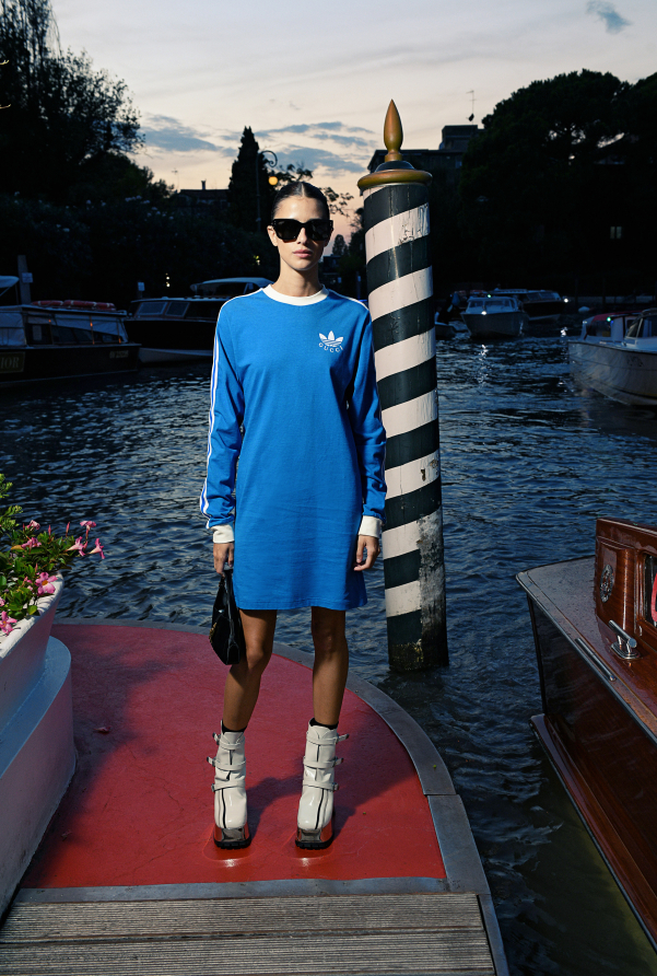 Benedetta Porcaroli 身着adidas x Gucci联名系列蓝色长袖针织T恤裙,搭配白色橡胶底带扣皮靴和黑色缎面Jackie 1961迷你手袋,佩戴黑色醋酸纤维太阳眼镜,抵达Excelsior酒店。