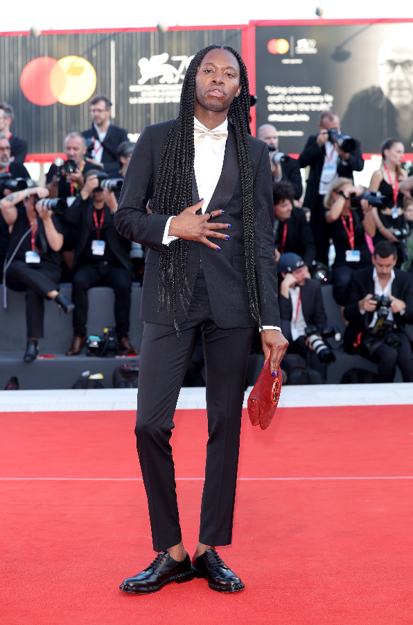 Jeremy O. Harris 身着古驰黑色一粒扣缎面披肩翻领燕尾服,搭配白色晚宴衬衫、香槟色缎面领结、黑色皮鞋和酒红色绒面Gucci Blondie手袋,出席电影《亲爱的别担心(Don't Worry Darling)》首映礼。