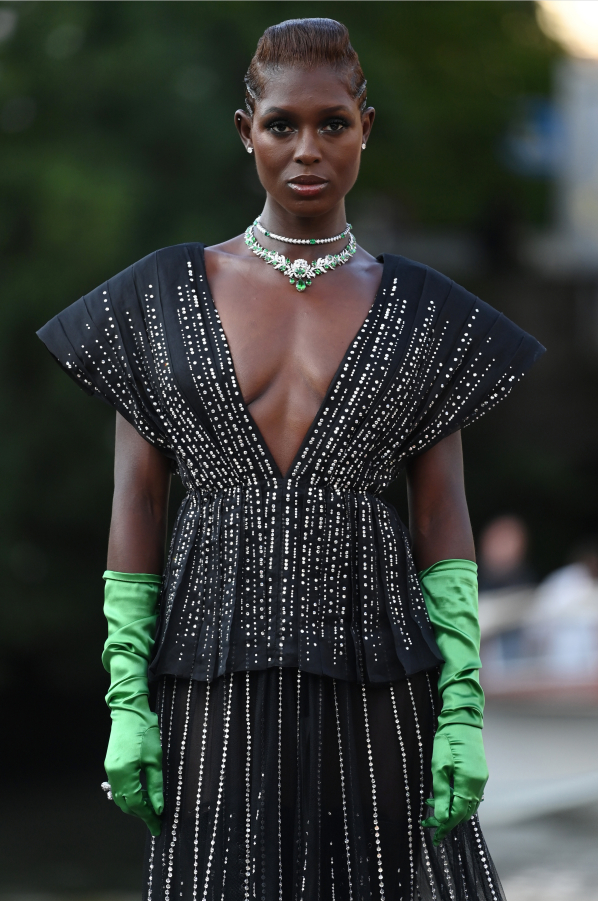 演员Jodie Turner-Smith 身着古驰定制款黑色雪纺及褶皱真丝欧根纱礼服裙,裙摆饰有水晶刺绣和亮橙色天鹅绒褶皱细节,配以翠绿色乙烯基手套,黑色高跟过膝皮靴以及饰有水晶蝴蝶结的黑色缎面手袋。搭配一系列古驰欢愉之园高级珠宝,白金钻石项链镶嵌沙弗来石,白金钻石颈链镶嵌祖母绿宝石,白金钻石戒指镶嵌红宝石,白金钻石戒指镶嵌帕拉伊巴碧玺,以及一枚白金钻石戒指镶嵌祖母绿,出席电影《白噪音(White Noise)》首映礼。