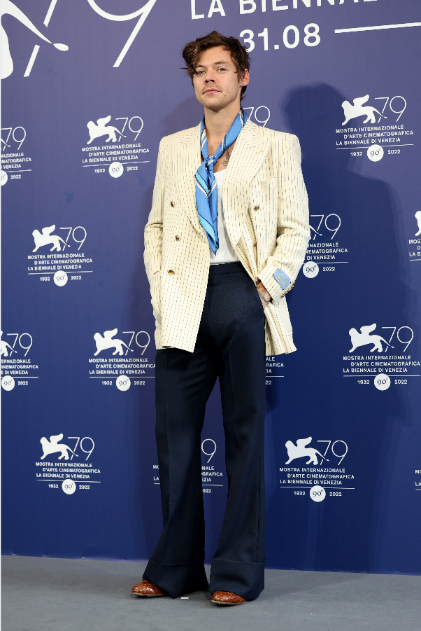 Harry Styles 身着Gucci HA HA HA系列奶油色水洗条纹双排扣翻领夹克,搭配象牙色罗纹棉质背心、深海军蓝色钻饰喇叭裤、蓝色与象牙色印花丝巾,以及棕色流苏细节皮鞋,出席电影《亲爱的别担心(Don't Worry Darling)》新闻发布会。