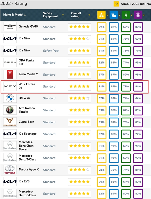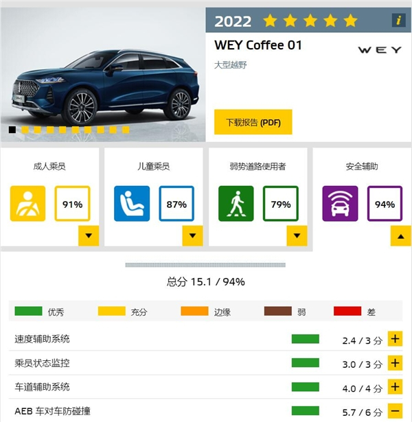 此次的碰撞结果显示,魏牌摩卡PHEV在成人乘员、儿童乘员、弱势道路使用者、安全辅助四个单项中得分率分别为91%、87%、79%、94%,均获得五星安全评级。魏牌摩卡成为ENCAP主动安全得分最高的自主车型。这一成绩比肩特斯拉Model Y。