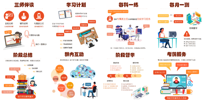 在备考的过程当中,学员会面临多种多样的挑战和困难,其中最具共性的问题就是难以坚持!静下心学习几天,相信大部分人都能做到,但如果说要坚持高效地学习几个月,那对学员的自律性要求就非常高了。名师团队根据上万名学员的学习习惯,不断总结优化,形成了由授课老师、辅导老师和学管老师,三师全程伴读的服务模式,覆盖授课、答疑、辅导、督学等多个维度,有效改善了学员在备考过程中的坚持问题。