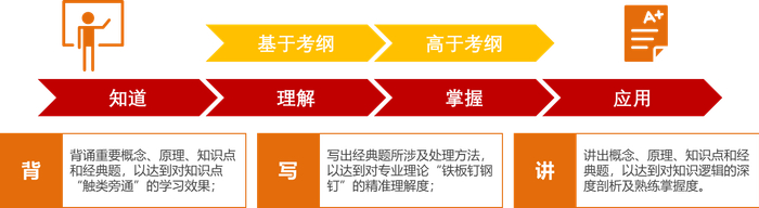 教研团队也始终坚持“帮助考生高效、快速通过考试”的核心教学理念,不断深入研究考试,研究考生,总结、归纳、凝练备考策略和学习方法,讲授的各类课程“基于考纲”且“高于考纲”,不但帮助学生备战考试,更帮助学生从“知道”“理解”“掌握”“应用”多个层面系统掌握知识,倡导并推动“知其然,知其所以然”的学习和教学理念。并创新了“背、写、讲”粉末化学习法,要求“重要概念、原理、知识点和经典例题背出来、写出来、讲出来”,最终将知识“内化”为学员自己的。