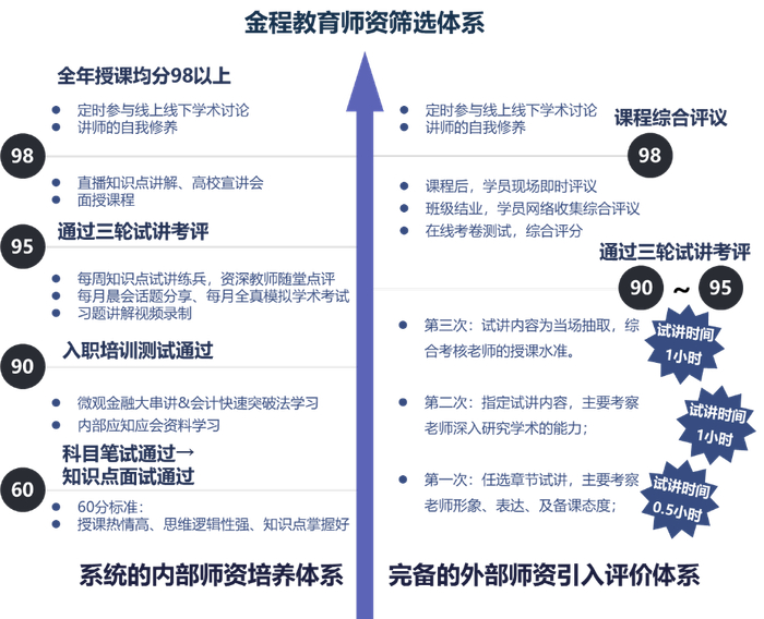 金程教育自创立以来,一路历经四代师资传承,设立体系性地师资“选、用、育、留”培养机制,内设一库(师资备课资料库)、两会(教学委员会、教学研讨会)、三制度(师资培养制度、师资评估机制、质量跟踪机制)师资管理办法,凭借扎实过硬的教研、教学能力,建立了一套完整的师资培育体系。金程教育也在内部成立了跨项目、跨学科的学术交流机制和交流团队,并设立了四项教师评价标准。