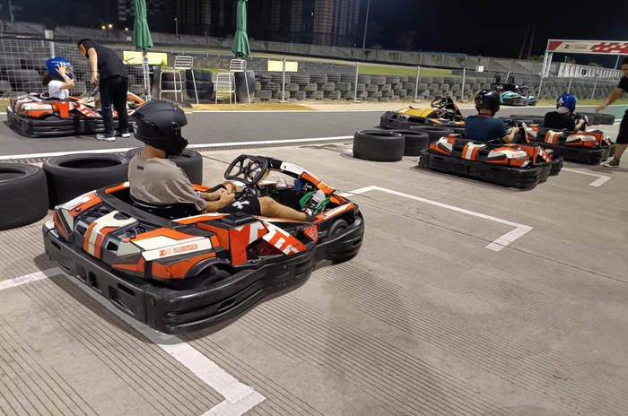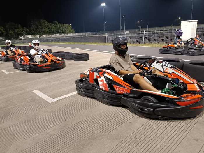 这两天高温,我和男友不想顶着烈日玩耍,就买了周末夜场票,时间是晚上6点到9点。我们差不多5点到的浙江国际赛车场,找到卡丁车体验区后给前台验票,前台会提供一个手环,之后就能入场了。正式上赛道前,会有教练做简单的培训,教我们开卡丁车的诀窍,还会讲一些突发情况的处理,然后分配头盔,再带我们到卡丁车停车的地方,准备上车。
