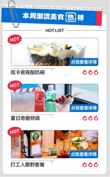 在小红书「超好吃补给站」“今天吃什么”的活动H5里,搜罗并聚集了大量当下的人气美食和吃法,编辑成“本周潮流美食热榜”,对于不知该决定吃什么的人来说,直接从榜单上挑出一款是一个高效又优质的选择,作为美食博主们精选的潮流美食,即便盲选也很难踩雷。