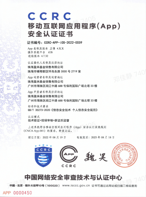 据悉,盈米基金还建立了完善的个人信息保护规范制度体系,从源头保障投资者的个人信息安全;利用不断迭代的金融科技,为投资者提供一个更安全、更便捷、更具有获得感的投资体验。此次且慢APP获得国家级的安全认证,不仅是对盈米基金个人信息保护工作的肯定,更是盈米基金未来继续做好信息安全保障实践的新起点。
