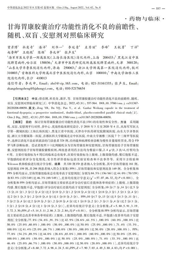近日,由中国工程院院士、国家消化系统疾病临床医学研究中心主任李兆申教授牵头,联合世界中医药学会联合会消化专委会会长张声生教授等七家知名三甲医院十余名消化专家共同开展的《甘海胃康胶囊治疗功能性消化不良的前瞻性、随机、双盲、安慰剂对照临床研究》在消化领域权威学术期刊《中华消化杂志》发表[1]。