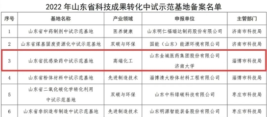 日前,山东省科学技术厅发布《关于公布2022年山东省科技成果转化中试示范基地备案名单的通知》,对全省首批15家获批单位进行公布,由金城医药集团、济南大学联合申报的“山东省抗感染药中试示范基地”成功获批,成为所属产业领域中唯一获批企业。