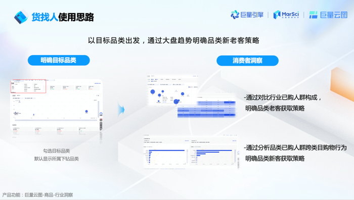 值得一提的是,本次【行业洞察】升级的重要动作之一,就是推出了新功能“消费者洞察”。“消费者洞察”旨在帮助品牌通过市场大盘趋势,判断市场背后的购物人群结构规律,帮助商家确立品类老客与新客策略,支撑品牌“货找人”策略的落地。具体的应用场景可分为: