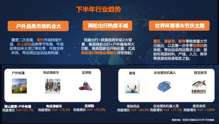 值得关注的是,今年户外社交复苏叠加世界杯等重大国际赛事,正在引发一系列趋势单品崛起。户外帐篷、电动滑板车、足球鞋、瑜伽用品、泳池清洗机器人、路亚鱼饵等在国际站上的询盘量增长迅速,其中在低碳出行和欧美政府补贴两大背景下,兼具绿色出行、户外健身两大功能的电动自行车和电动滑板车异军突起,电动滑板车在国际站上的询盘量年同比增长达70.3%;户外品类上,用于户外露营的帐篷依然保持着21.7%的询盘增长,垂钓市场和水上运动品类即将迎来大货订单旺季,路亚鱼饵询盘量年同比增长高达109%。
