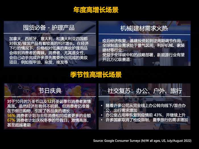 虽然受疫情通胀影响,国外消费者信心指数处在较低水平,但据Google Consumer Surveys的调查显示,对于10月的万圣节以及12月的圣诞季,消费者激情高涨,其中56%的消费者计划与去年消费相同或者更多的金额;67%的消费者计划庆祝冬季的节假日,热度甚至超越暑期。
