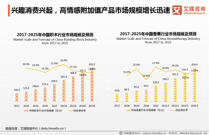 值得关注的是,在兴趣消费风潮的带动下,高情感附加值的产品市场发展潜力逐步释放。以积木和香薰为例,艾媒咨询数据显示,2022年中国积木行业市场规模预计达261.9亿元,香薰市场规模预计达146.2亿元。