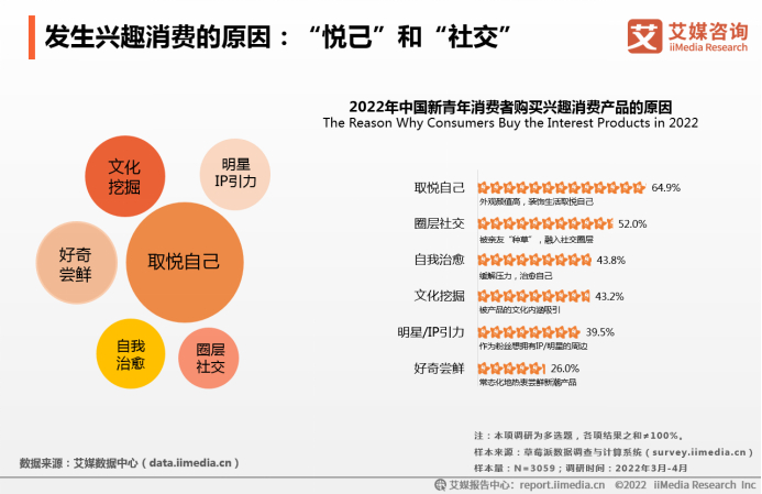 iiMedia Research(艾媒咨询)新近发布的《2022年中国兴趣消费趋势洞察白皮书》(以下简称《白皮书》)中,3059个样本反馈新青年(1990-2009年出生)的兴趣消费发生原因、消费品类、影响因素等,圈定了兴趣消费的范围。《白皮书》总结出新青年群体对于悦己消费、圈层融入等需求对兴趣消费产生的影响,为消费品牌进一步了解兴趣消费风潮、融入新消费群体的圈层提供参考帮助。
