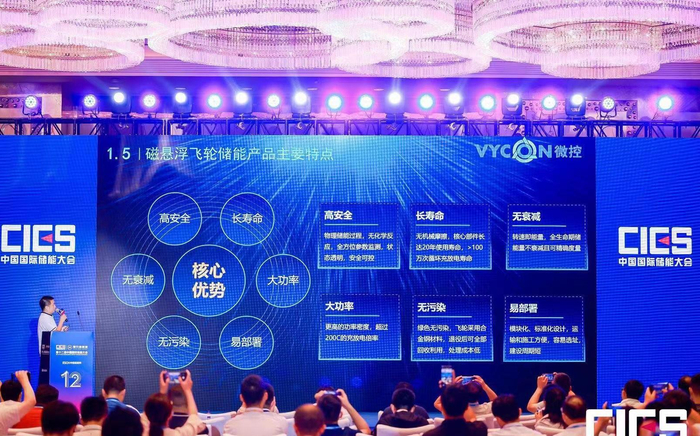 大会第二天,微控发布了全球领先的重磅新品——具有高度集成化设计、电力调频应用调优等特性、国内首套面向电力调频应用的兆瓦级一体化高速磁悬浮飞轮储能系统。公司副总裁陈烨首先详细介绍了该系统的构成,其次,介绍了产品的“七超”优势:超高密度、超长寿命、超快响应、超高精度、超高效率、超高安全、超低损耗等。最后,介绍了产品的诸多应用场景,如独立/共享飞轮储能调频电站、新能源场站集中式储能一次调频及惯量响应、火电机组一次调频及惯量响应等。微控凭借储能领域的硬核科技,赢得了在场业界专家学者的广泛关注与高度赞誉。