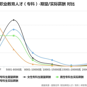 交叉专业分类和实际薪酬来看,在受访专科毕业生期望的5001-8000元薪酬区间内,能源动力与材料、装备制造、资源环境与安全三类专业的实际薪酬达到受访专科毕业生预期的比例超过六成。而公安与司法、水利和轻工纺织类,实际平均薪酬低于5000元。在5000元以下的薪资区间内,女性比例高出男性四分之一,而在5001-8000元区间,男性比女性高出近两成。总体来看,受访专科毕业生中,男性获取的实际薪酬高于女性。