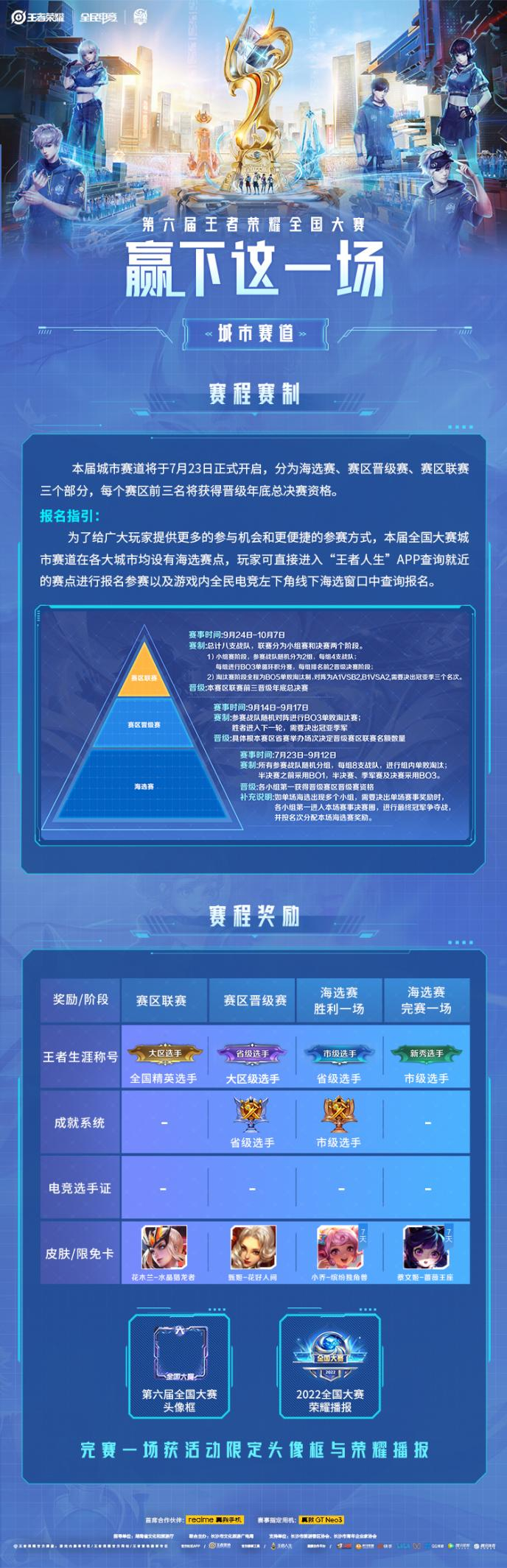 王者荣耀全国大赛体系在2022年下半年进行了赛制改革,本届全国大赛游戏赛道、城市赛道与合作赛道将进行赛制全新升级。新赛制在保留三条赛道入口的同时,强化了赛段概念,整体赛程将分为:海选阶段,赛区阶段以及决赛阶段三个赛段。最终三条赛道的队伍在资格赛争夺晋级全国大赛决赛阶段的名额。第五届和第六届冠军胜方将直通甲级职业联赛(KGL), 败方获得甲级职业联赛(KGL)资格赛名额;第五届和第六届亚军争夺另一资格赛名额。