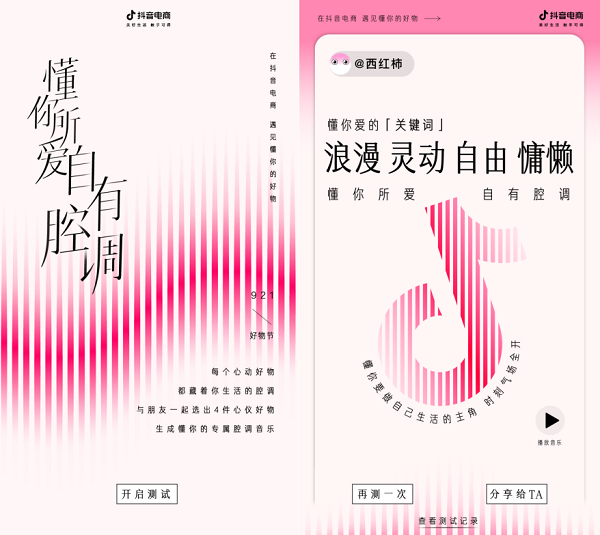 懂你的抖音电商,还用一个H5测试再次引爆了朋友圈。通过用户选择不同的好物标签,生成自己的专属腔调音乐,这种尝试也是业界首次。凌厉的品牌营销组合拳,让“遇见懂你的好物”一登场就收获了行业和用户的广泛好评。更多精彩的营销内容,我们将持续关注。
