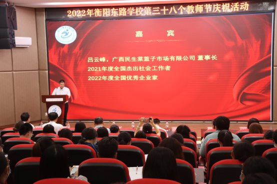 双节同庆,丹桂飘香。为庆祝教师节的到来,鼓舞教师斗志,共建教育力量,2022年9月9日,广西民生菜篮子市场有限公司董事长吕云峰、副总经理张付,受南宁市衡阳东路学校邀请作为特邀嘉宾,参加2022年衡阳东路学校第三十八个教师节庆祝活动。