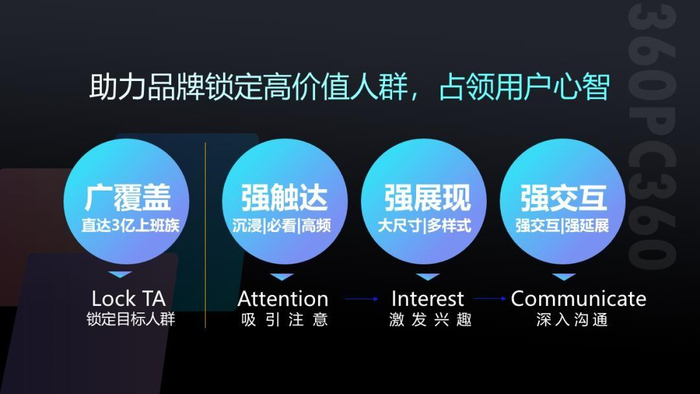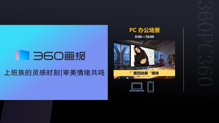 作为PC屏幕最极致的展现形式,360PC锁屏画报覆盖办公场景,通过优质的展现形式给用户带来极具震撼的视觉体验,帮助品牌与受众建立深度沟通。同时,360PC锁屏画报合理的展现机制解决了“屏保”时间里屏前“没人”的困境,实现解锁必触达,这也成为360PC锁屏画报展现力的核心优势之一。充分考虑到用户的使用场景、情感色彩、行为习惯等因素,360PC锁屏画报让每一次展现都“合情合理”,让每次触达都精准有效。