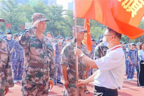 随后,由教育教学尹朝安校长为新生军训教官授旗,教官们那一张张年轻又充满力量的面孔在此刻只有庄重神圣,一面面授旗被郑重地接过并紧握,风起旗扬,承接军训铸魂育人的责任与担当!