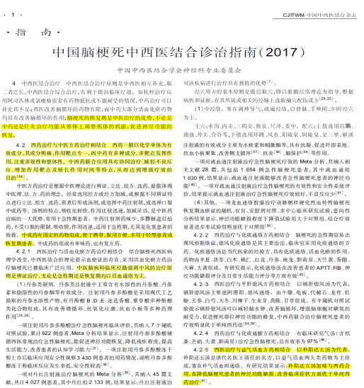 《中国脑梗死中西医结合诊治指南(2017)》推荐西医治疗(银杏叶类制剂)与益气活血方药(补阳还五汤)相结合,具有协同治疗、增加作用靶点及延长时间等特点,从而提高综合疗效,减轻不良反应。