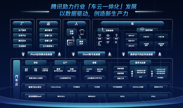 同时,基于智能汽车云平台,腾讯通过中间的IPaaS应用集成连接器、IDaaS账号连接器、微搭低代码应用连接器等,可快速支撑厂、店、人、车等多端的不同场景。