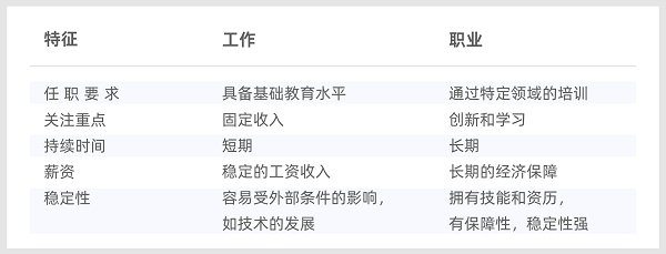 由于难以区分工作与职业,导致妈妈们对很多工作感到不满意以及容易产生无目的感。因此,你必须记住,工作的目的主要是实现财务稳定,而职业生涯则是由你的激情所驱动,由你的工作职责、经验、教育经历和工作途径组合而成。下表进一步概述了工作和职业之间的一些主要区别。