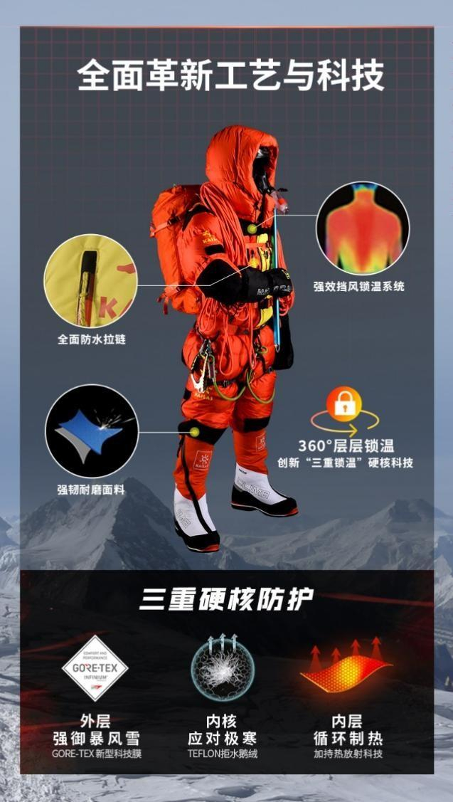 其中,高海拔产品8000GT连体羽绒服——这款作为攀登高海拔雪峰的必备装备,拥有出色平衡防风性与透气性,能有效避免高强运动后汗湿失温。在历经五代更迭后,以全新革新工艺与科技,集齐顶尖轻量科技带来三重硬核防护,分别是外层的GORE-TEX新型科技膜强御暴风雪、内核的TEFLON拒水鹅绒应对极寒、内层的加持热放射科技循环制热;不仅如此,高海拔产品8000GT连体羽绒服内藏乾坤,通过金属热放射科技在肘部、膝盖、背部三个易冷部位增加了快热纤维,比一般发热纱更具保温效果,能吸收皮肤发散的热能,进而达到聚热升温之效果。