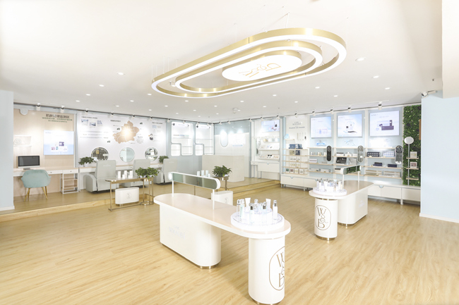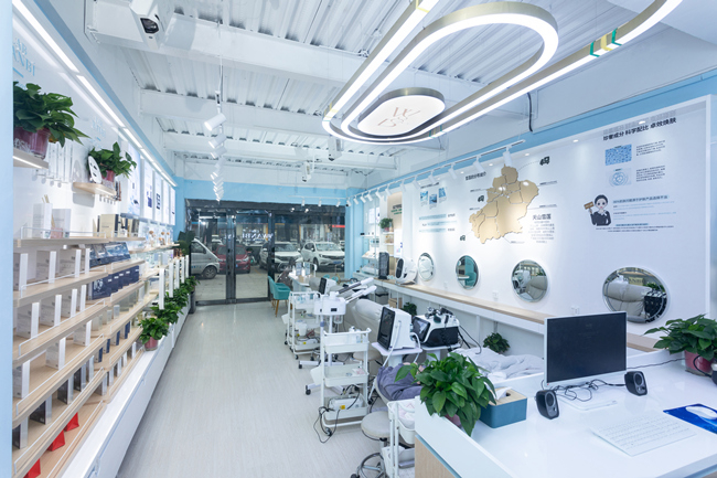 丸碧旗舰店以品牌色瓦尔登湖蓝与丸碧主打成分雪莲的圣洁纯白相呼应,将高奢体验感贯穿整个空间,带给顾客仿佛置身于静谧大自然的沉浸式护肤体验。并且打破以往传统密集式的产品陈列模式,在布局上,合理利用空间布局将产品按功效分布在店内的每个空间。同时丸碧旗舰店将推出的多款产品与科学检测仪器相结合,旨为为客户提供一对一、定制化的专属护肤方案。