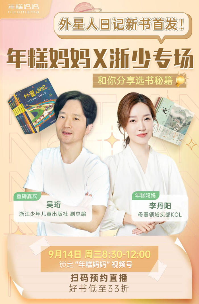 9月开学季,孩子陆续要添置新的读物了。不少家长在给孩子选书的问题上头疼。为解决家长育儿难题,9月14日上午,年糕妈妈李丹阳邀请浙江少年儿童出版社的副总编吴珩老师做客年糕妈妈图书直播间,从专业的角度向家长们聊聊给娃选书这件事。同时,本场直播也是浙江少年儿童出版社新书《外星人日记》的首发平台。