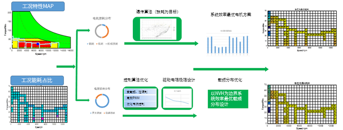 整机参数优化:极槽配合、定转子内外径、气隙尺寸;高效区定向优化和NVH设计目标设定;