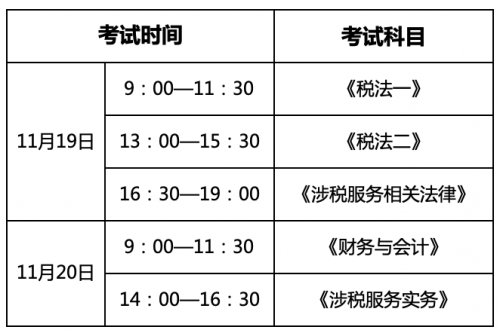 今年的税务师考试将于11月19日至20日举行,本次考试采用闭卷计算机化考试方式,考生可在11月14日10:00至11月20日15:00期间登录报名系统自行下载打印准考证。税务师各科目考试时间具体安排如下: